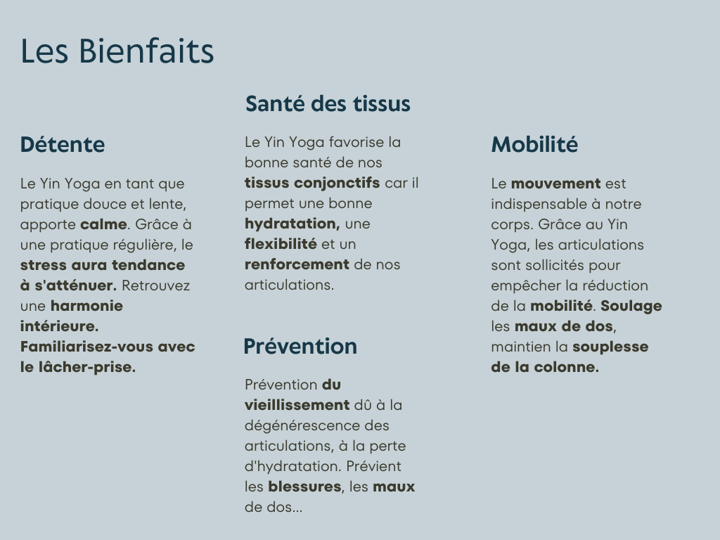 Le Yin Yoga s'inscrit dans une pratique presque passive et méditative. Sans action de notre part, le corps, le mental s'installe dans un